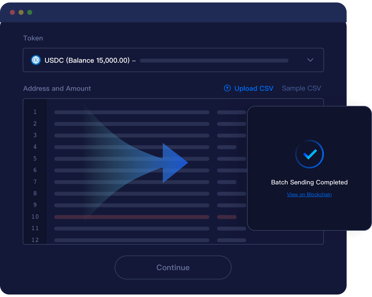 The DAPP allows users to send hundreds of cryptocurrency transfers in a batch process by uploading a CSV. You can view the Blockpurse MultiSender smart contract as well as previous transactions on the blockchain browser.