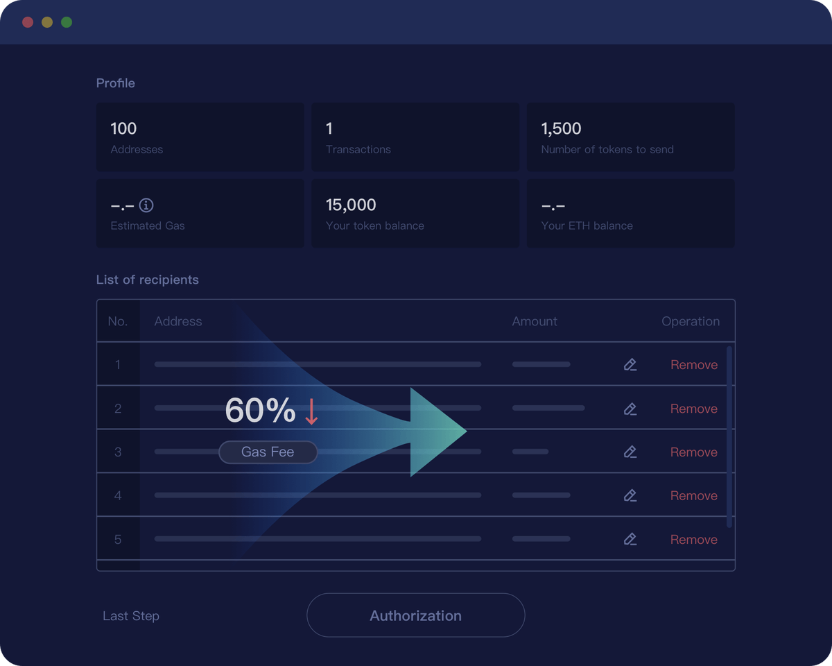 Take 100 Ethereum transactions as an example, Blockpurse help you save gas fee by 60% and operating time by 99%.